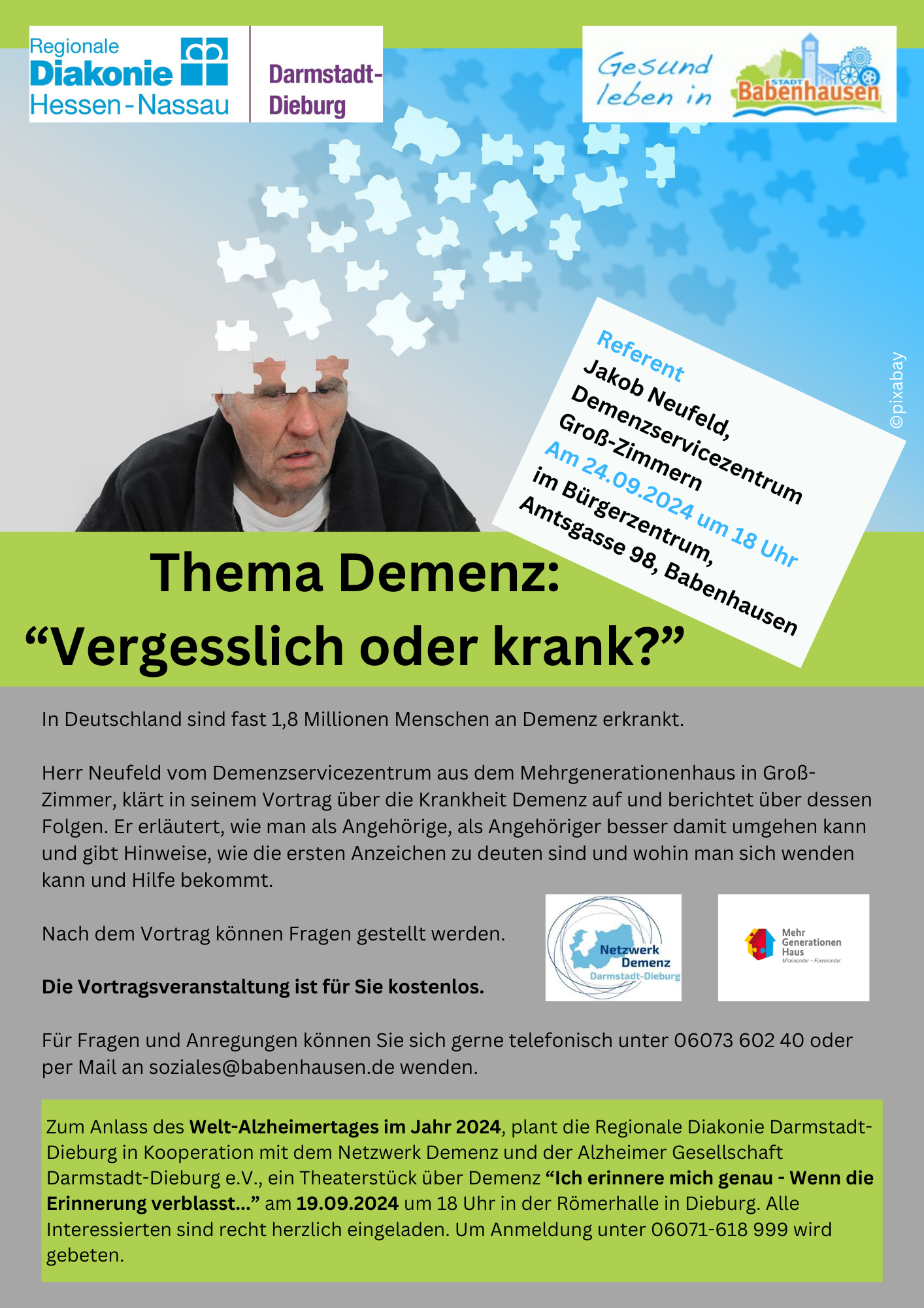 Zum Anlass des Welt-Alzheimertages im Jahr 2024, plant die Regionale Diakonie Darmstadt-Dieburg in Kooperation mit dem Netzwerk Demenz und der Alzheimer Gesellschaft Darmstadt-Dieburg e.V., ein Theaterstück über Demenz “Ich erinnere mich genau - Wenn die Erinnerung verblasst...” am 19.09.2024 um 18 Uhr in der Römerhalle in Dieburg. Alle Interessierten sind recht herzlich eingeladen. Um Anmeldung unter 06071-618 999 wird gebeten.